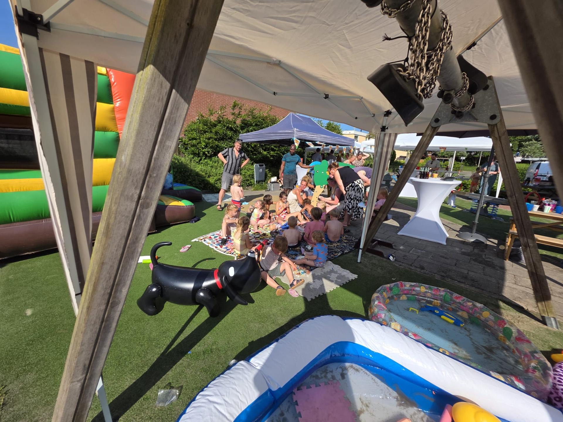 De zon scheen volop, dus 's morgens genoeg schaduwplekken gecreëerd met de buren. Toen kwamen het springkussen, de zwembadjes, de picknicktafels en de speelkleden. Alles kwam bij iedereen uit z'n tuin.