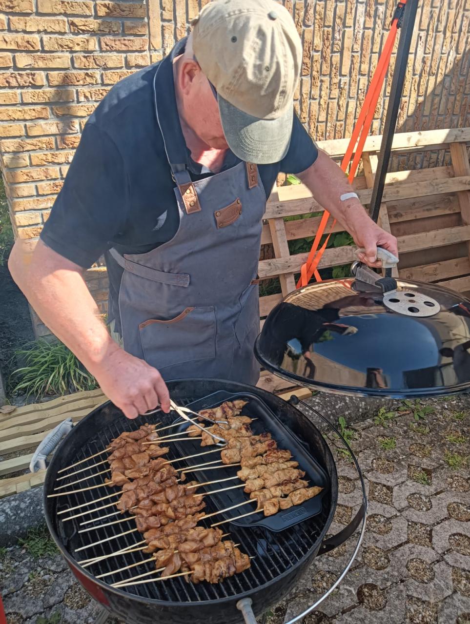 Het typische campingspel Kubbs werd gespeeld met aangepaste spelregels. Ook hier weer behoorlijk fanatieke spelers! Poelier Bart Vlaanderen had al tijdens het verzamelen van bonnen aangegeven dat hij heel graag, ook wel totaal belangeloos, sateetjes wilde komen bakken. Vlees, stokbrood en pindasaus zijn allemaal door hem geschonken....Fantastisch! Er zijn behoorlijk wat porties doorheen gegaan, het was heerlijk.