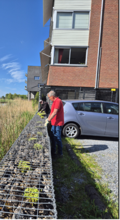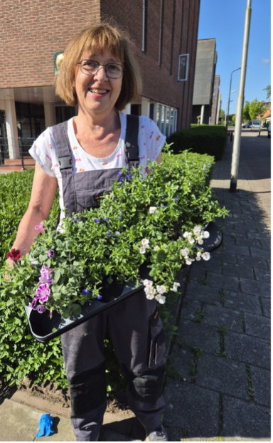 Met de bewoners van Villa 2000 hebben we op 3 mei 2025 in een stralend zonnetje rotsplantjes rond om de parkeerplaats geplant en eenjarige plantjes onder de heg.