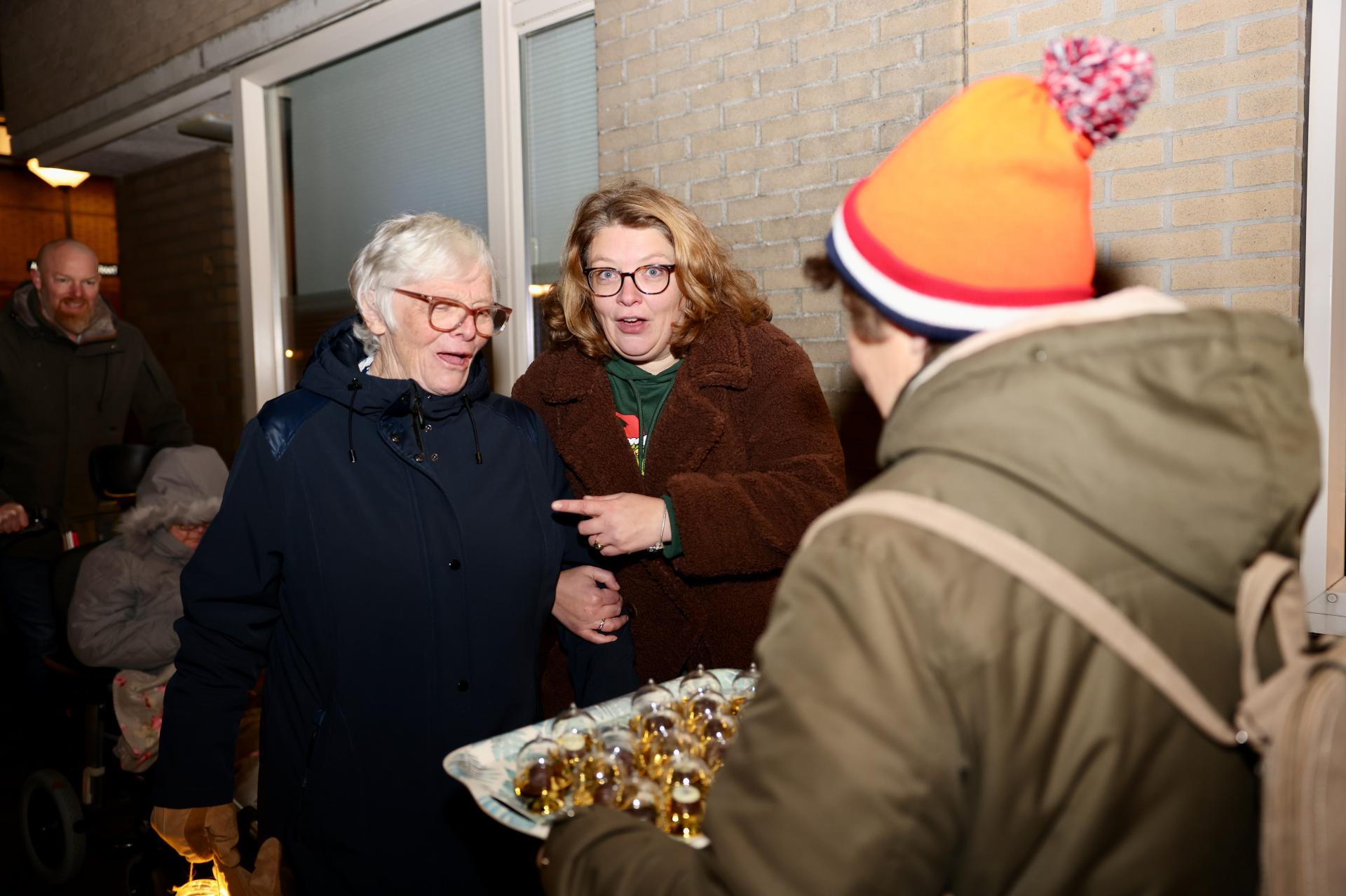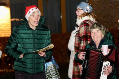 Daar werden we allemaal verwelkomd met muziek van Corrie en Elly, twee vaste muziekvrijwilligers. De mensen die wilden zongen vrolijk mee, en anderen hadden het te druk met de warme chocomel of gluhwein.