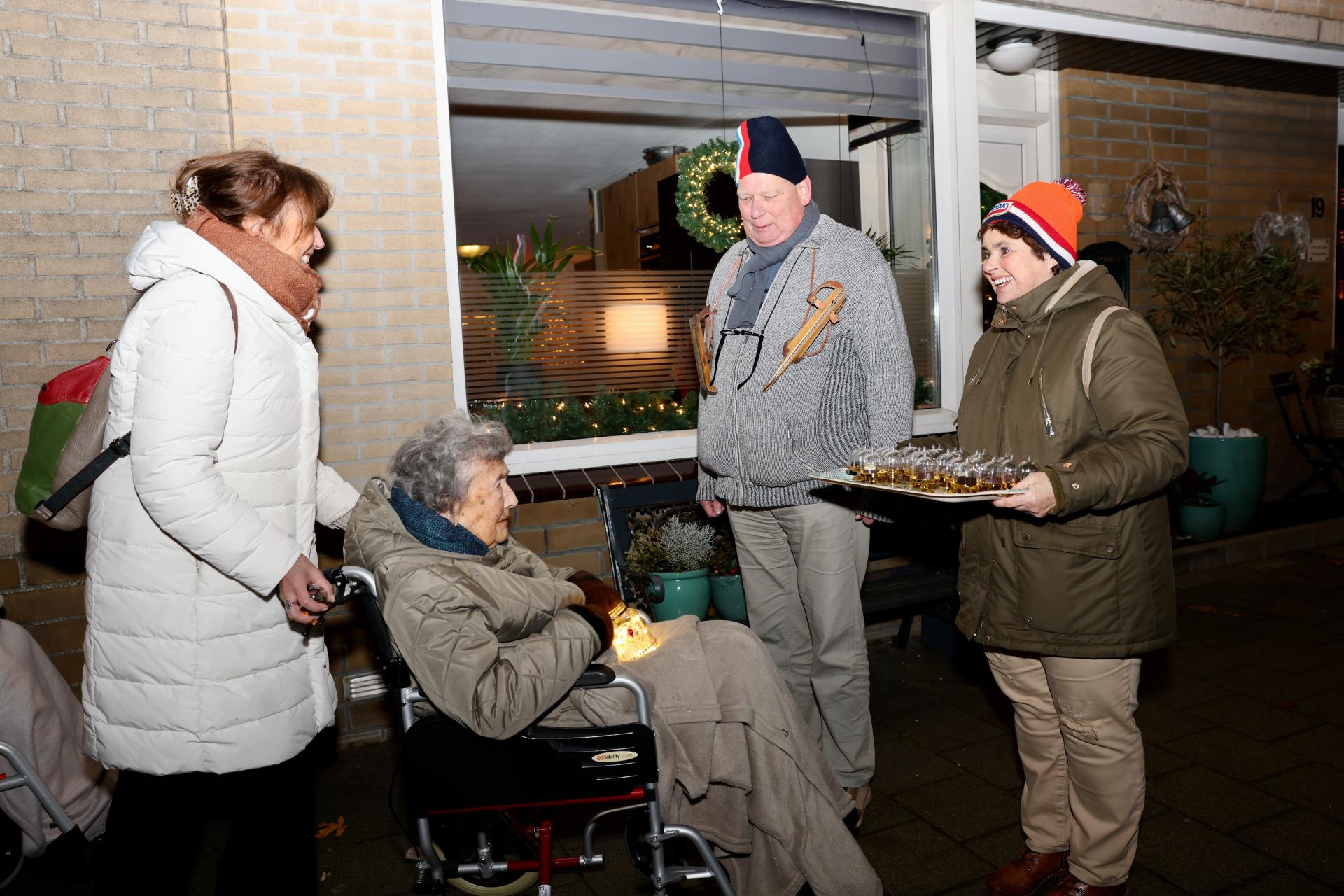 Een van de zorgmedewerkers die op de route woont had haar tuintje feestelijk versierd en stond klaar met een dienblad gevuld met heerlijke kaneelsterren. Haar dochtertje deelde ook weer cadeautjes uit.