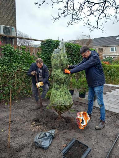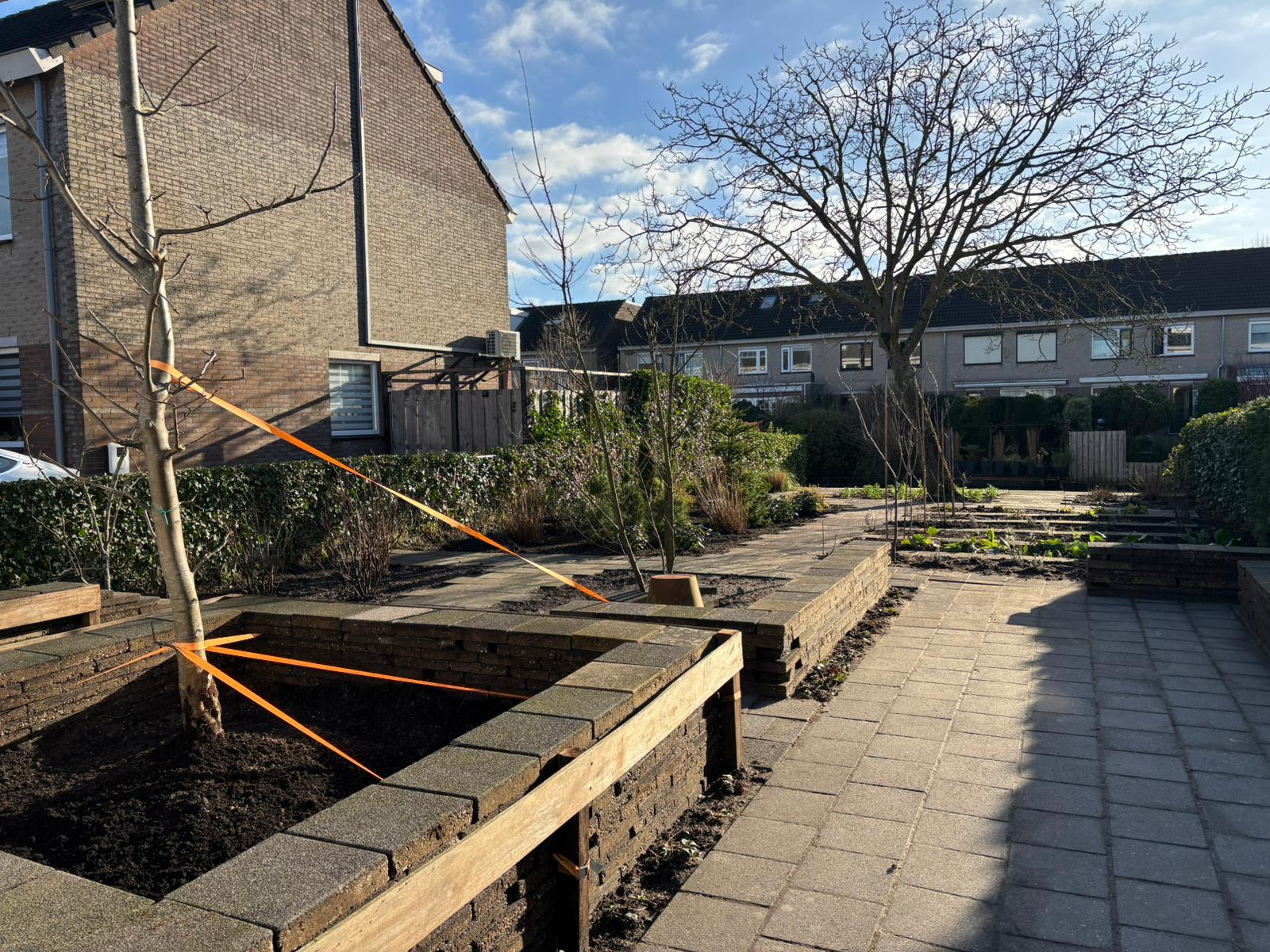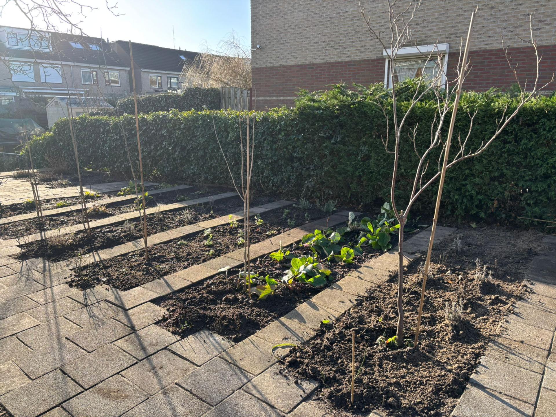 Met die tekst begon begin september 2024 ons buurtinitiatief op de website van Samen Velsen. Een initiatief om samen met de andere buurtbewoners dit plein te veranderen in een buurttuin. Maar voordat de buurttuin kon worden ingericht moest er nog veel gebeuren. Het begon natuurlijk met aan de directe buurtbewoners te vragen of iedereen het maken van een buurttuin een goed idee vond. Daarna werden er waardebonnen/donaties ingezameld om te zorgen dat er geld was om de buurttuin in te richten. De lokale krant en kabeltv vroegen om een interview en de gemeente gaf een bijeenkomst voor initiatiefnemers om hun initiatief meer bekendheid te geven en onderling contact te maken. Er kwam een ontwerp van de inrichting van de buurttuin en de bomen, struiken, planten en andere materialen werden gekocht (bij Loef en via Marktplaats) of gratis opgehaald (via een oproep op Facebook). En tot slot werden er allerlei zaken afgestemd met de gemeente.